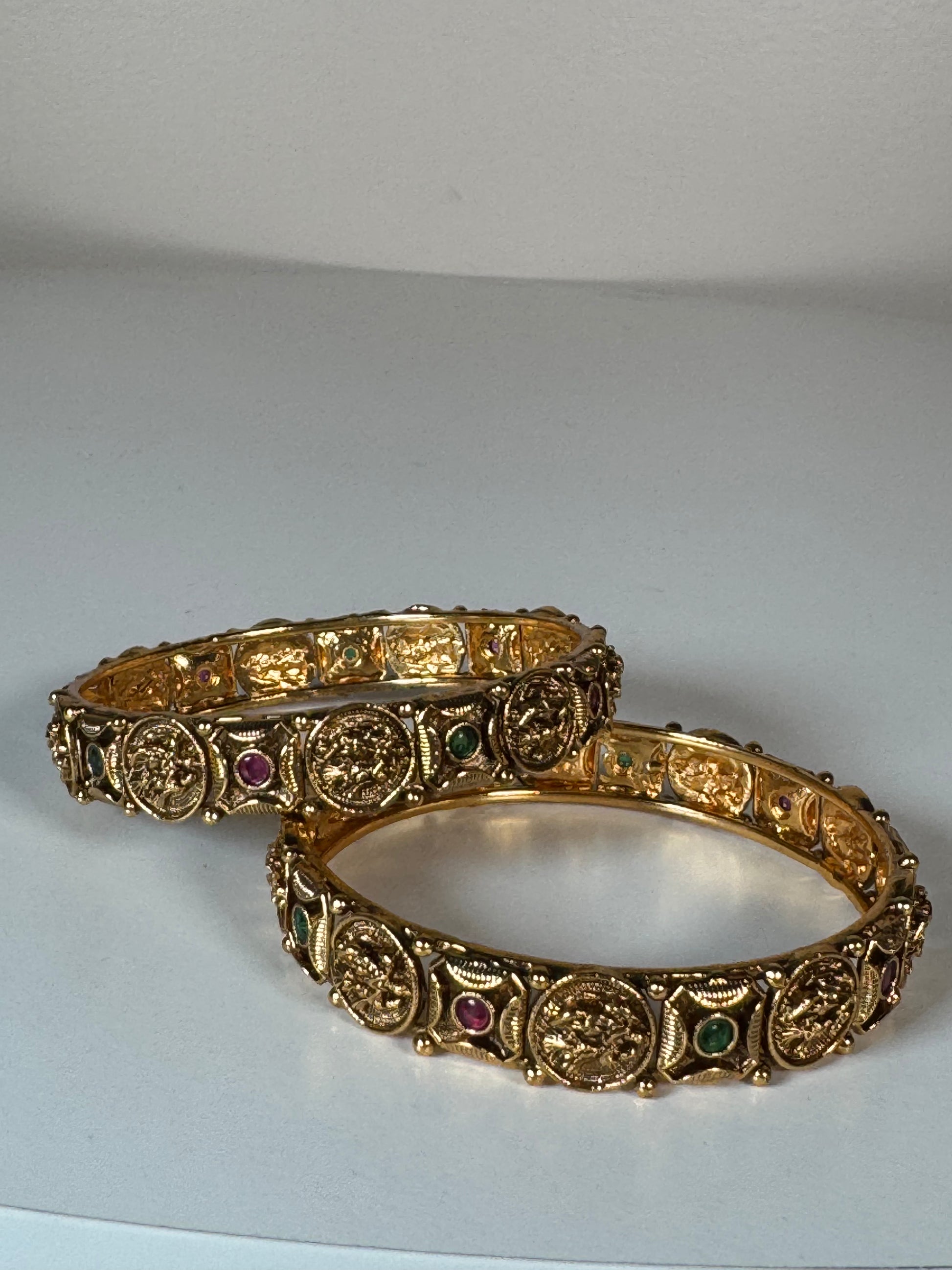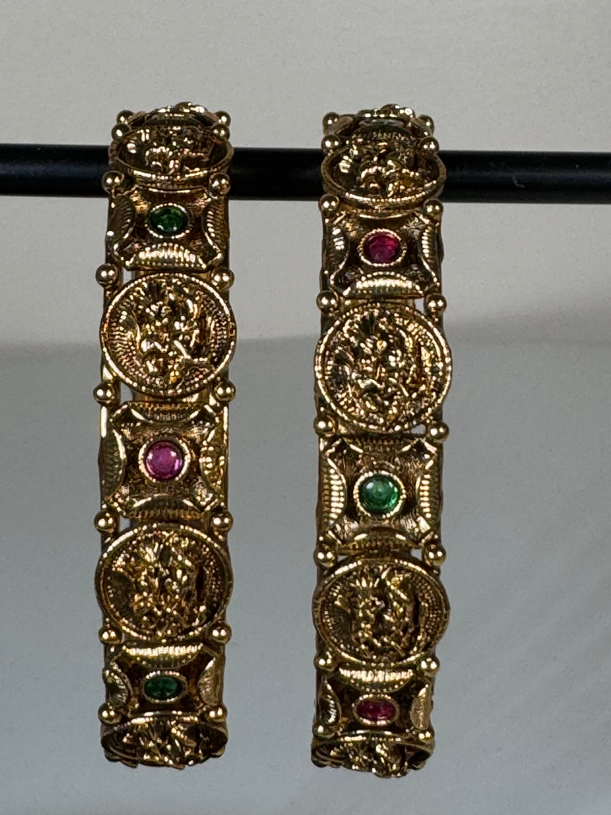 Adorn your wrists with these exquisite antique gold bangles featuring intricate engravings and colorful gemstones. Perfect for traditional and festive occasions, these bangles bring a blend of heritage and elegance to your jewelry collection.