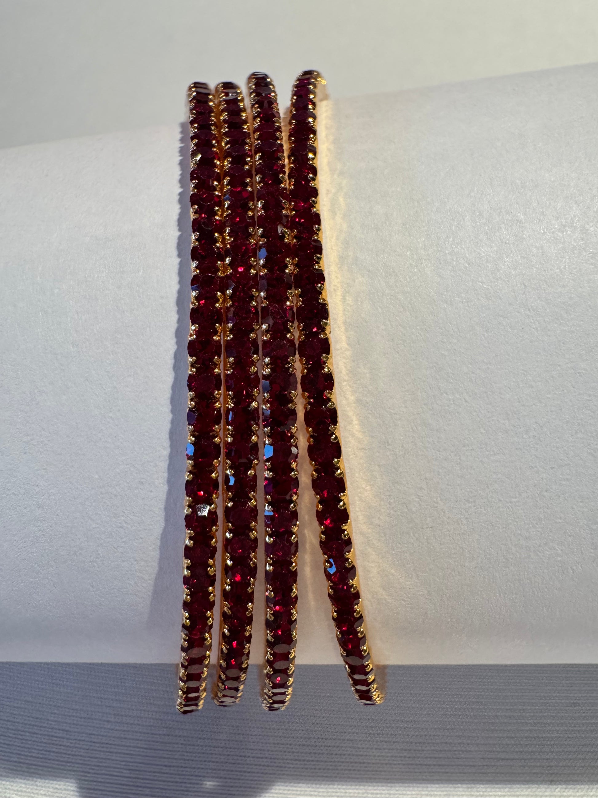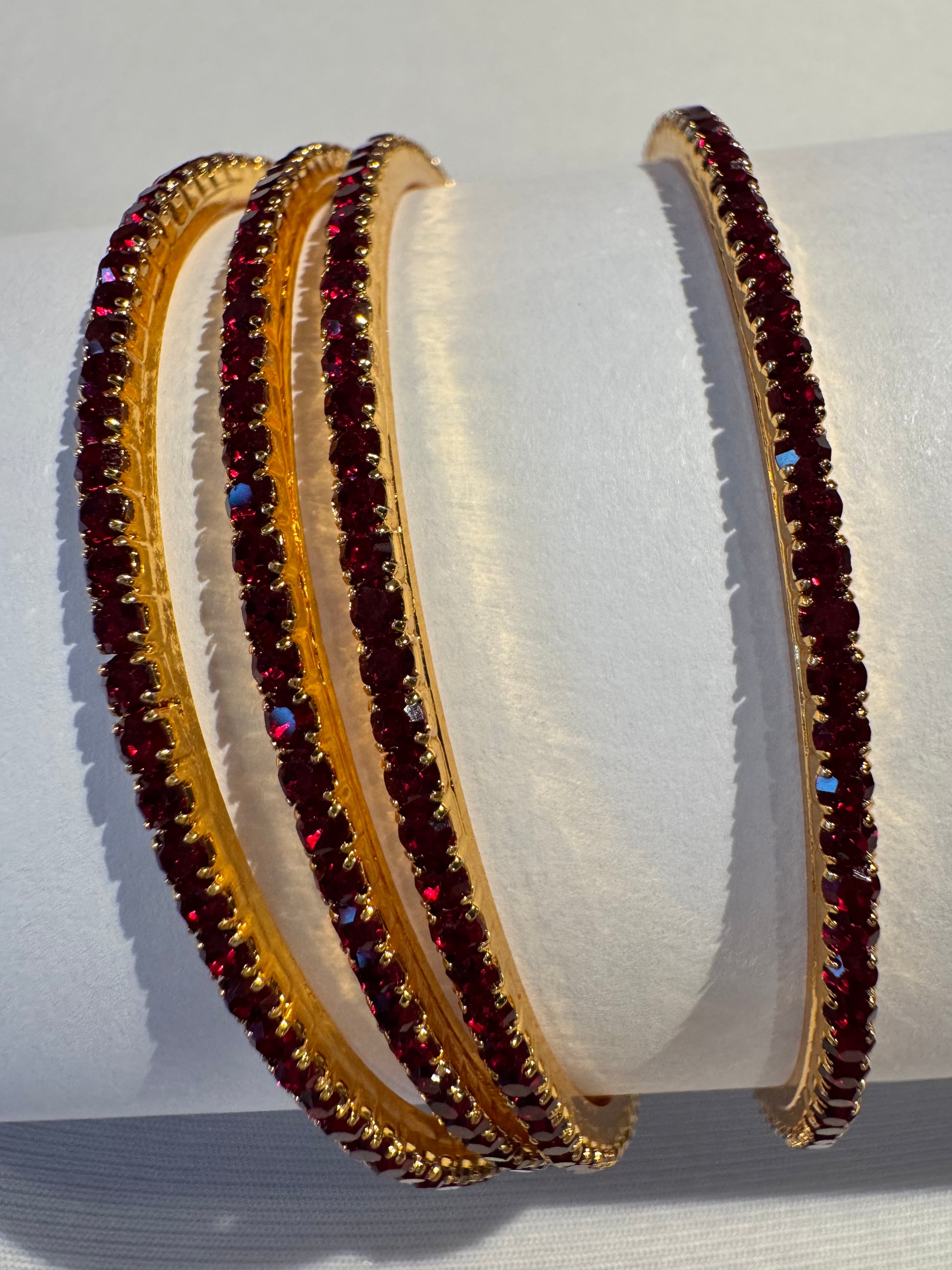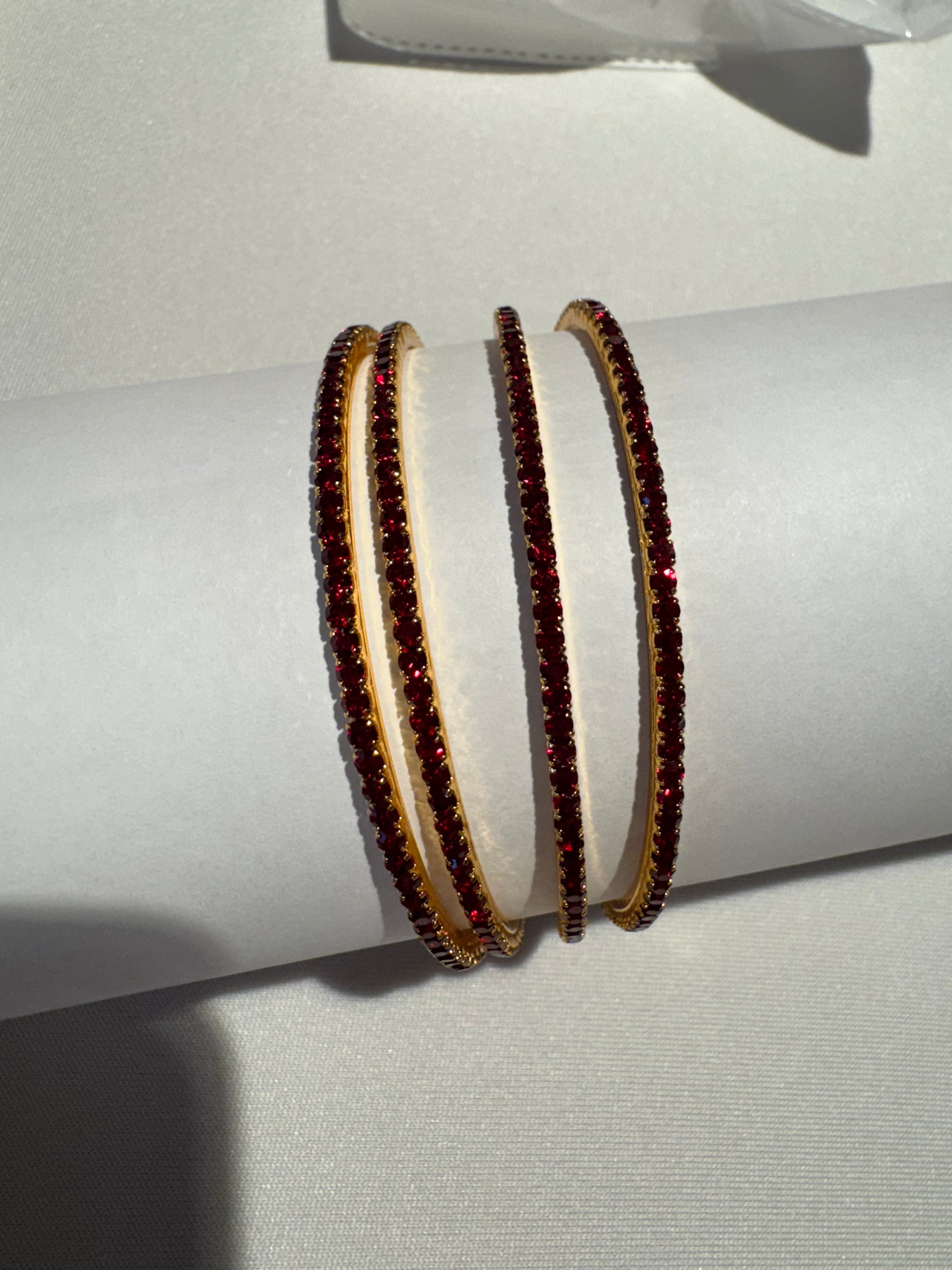 Grace your wrists with these stunning gold-plated bangles studded with deep red crystals, perfect for a classic and elegant look. Lightweight yet luxurious, they are ideal for weddings, festive events, or everyday wear to add a pop of color to any outfit